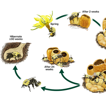 Deze nieuwe koninginnen paren met mannetjes, verlaten het nest en de cyclus gaat verder. De oude koningin en haar nest zullen in de late herfst op natuurlijke wijze verdwijnen.