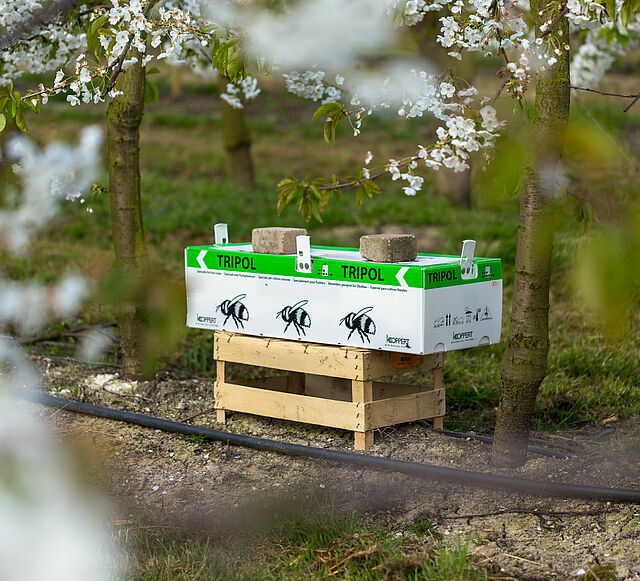 'Bestrijdingsmiddelen zijn slecht voor nuttige insecten en alles wat je kunt doen om het duurzamer te maken is een goede zaak,' voegt Alfred toe. De Tripol Nestkasten van Koppert werden zes jaar geleden in de appel- en perenboomgaarden geïntroduceerd toen Alfred, die al 35 jaar fruitteler is, merkte dat de bloesems niet optimaal bestoven werden door de honingbijen die op dat moment aanwezig waren. "Hommels zijn actiever dan honingbijen bij lagere temperaturen en we hebben gemerkt dat een combinatie van honingbijen en hommels een grote verbetering is. Alfred gebruikt twee Tripol nestkasten per hectare, om te beginnen in de perenboomgaard en vervolgens in het vroege voorjaar in de appelboomgaard.