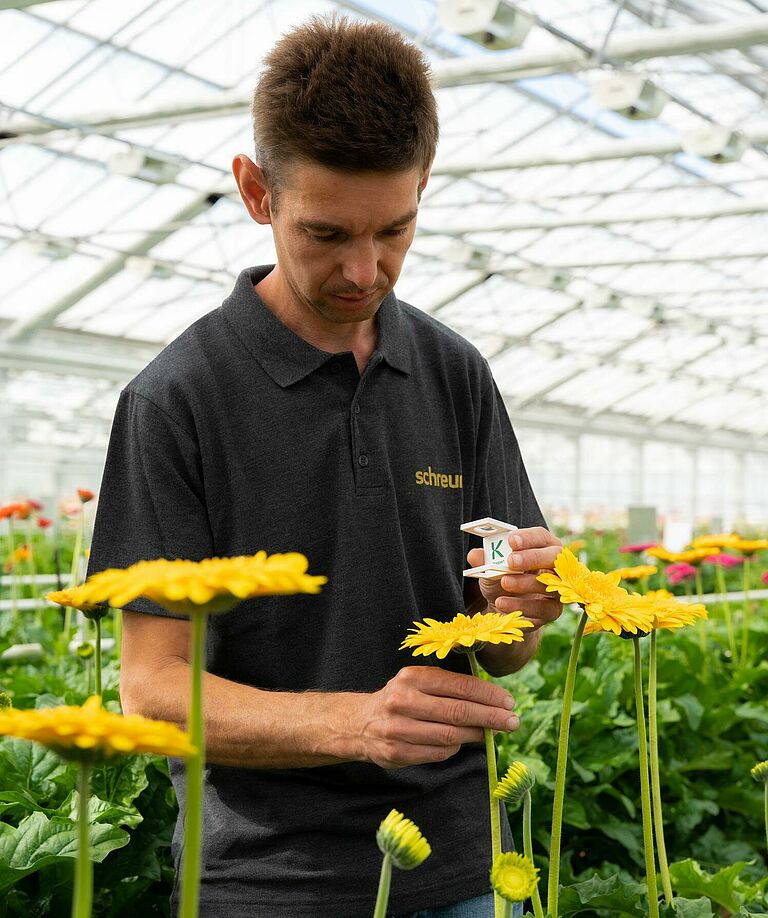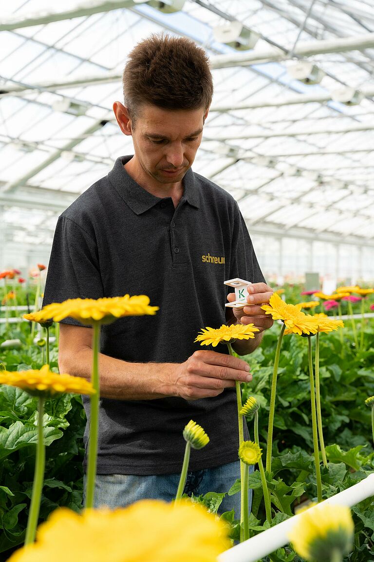 Henri Volgering, biologiemedewerker bij Schreurs, legt uit: "Scouten is erg belangrijk binnen deze teelt. Daarom houden we niet alleen wekelijks een telling van alle vangplaten, maar betrekken we ook iedereen die in de kas werkt om alert te blijven op plagen zoals de Tabakstrips (Thrips tabaci), Kaswittevlieg (Trialeurodes vaporariorum) en Duponcheliamot (Duponchelia fovealis). We willen er op tijd bij zijn als we moeten ingrijpen."
