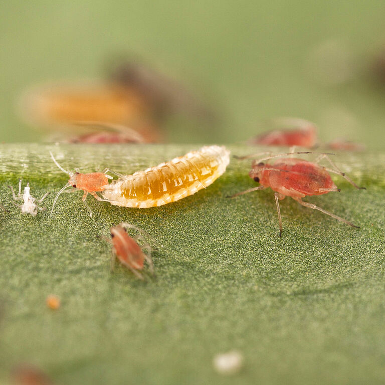 Larven: Dit is het stadium waarin de galmug actief bladluizen bestrijdt. De larven zijn klein en oranje met zwarte monddelen. Je vindt ze vaak op plekken waar veel bladluizen zitten.
