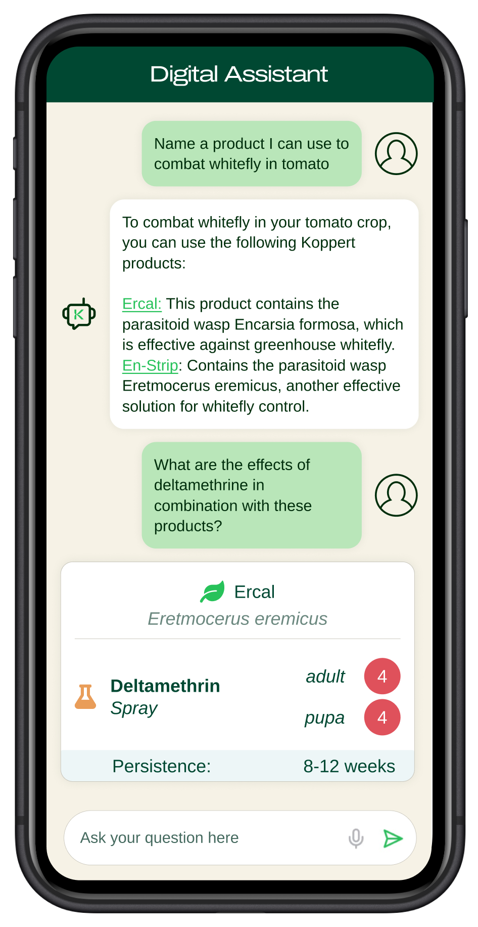 Koppert One biedt 24 uur per dag toegang tot kennis en ondersteuning. En deskundige begeleiding is slechts een klik verwijderd. Dit zorgt ervoor dat elke aanbeveling niet alleen op gegevens is gebaseerd, maar ook wordt gecontroleerd door menselijke expertise, waardoor telers verzekerd zijn van betrouwbaarheid en precisie.