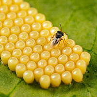 De volwassen vrouwelijke sluipwesp van Trissolcus basalis legt een ei in een gastheerei. De larve ontwikkelt zich in het gastheerei en na de verpopping kruipt de adult uit het gastheerei door een gat te bijten in de bovenkant van het schildwantsei.
