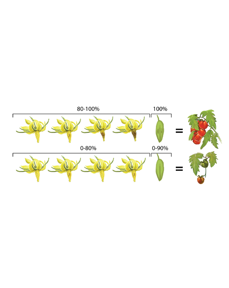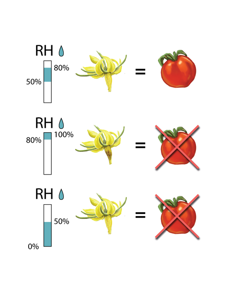 Onder de 50% RH neemt de kiemkracht van het stuifmeel af waardoor er problemen met vruchtzetting kunnen optreden. De hommels zullen het stuifmeel nog wel verzamelen en beetmerken achterlaten, maar er zal geen vrucht groeien.