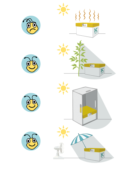 Hommels houden de temperatuur in de nestkast constant. Bij langdurige blootstelling aan een te hoge temperatuur kan schade aan de kolonie ontstaan. Plaats de hommelkast daarom op de koelste plek of minimaal in de schaduw, met name tijdens het warme deel van de dag. Zorg in de donkere winterperiode voor zonlicht. Schaduw kan komen van het gewas, een kratje of andere afschermingen. Bij extreme temperaturen zijn extra maatregelen nodig, zoals actieve koeling.