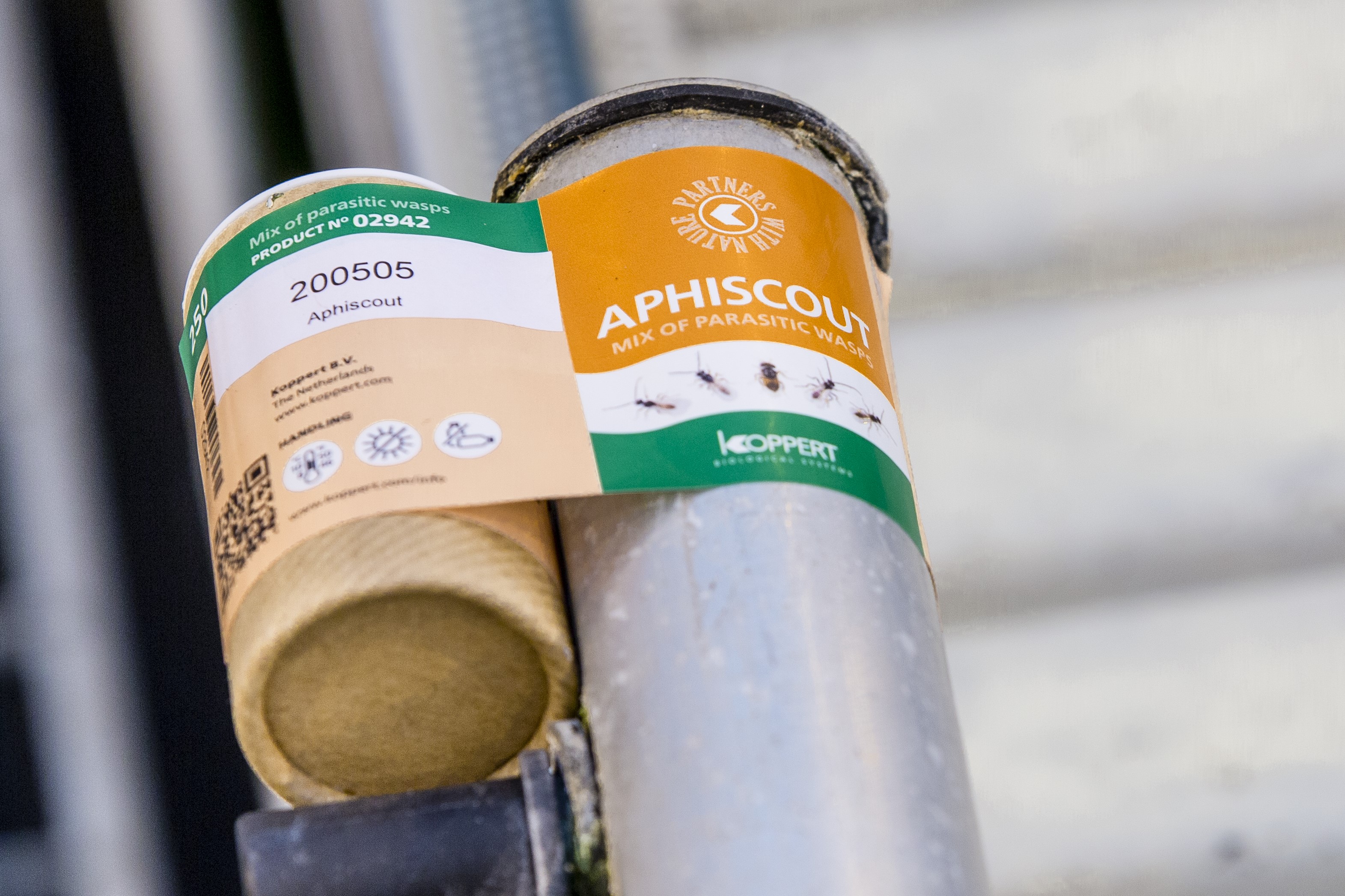 Anthura streeft ernaar om dit seizoen in deze afdeling geen chemie in te zetten en begint heel vroeg met de introductie van bestrijders. "We zijn in week 5 gestart met Aphiscout in een dosering van een halve sluipwesp per vierkante meter, met elke twee weken een herintroductie. De vijf bestrijders in Aphiscout moeten de luizen zo lang mogelijk onder controle zien te houden. Bij ons gaat het om de groene en de rode perzikluis, de katoenluis en de zwarte bonenluis."