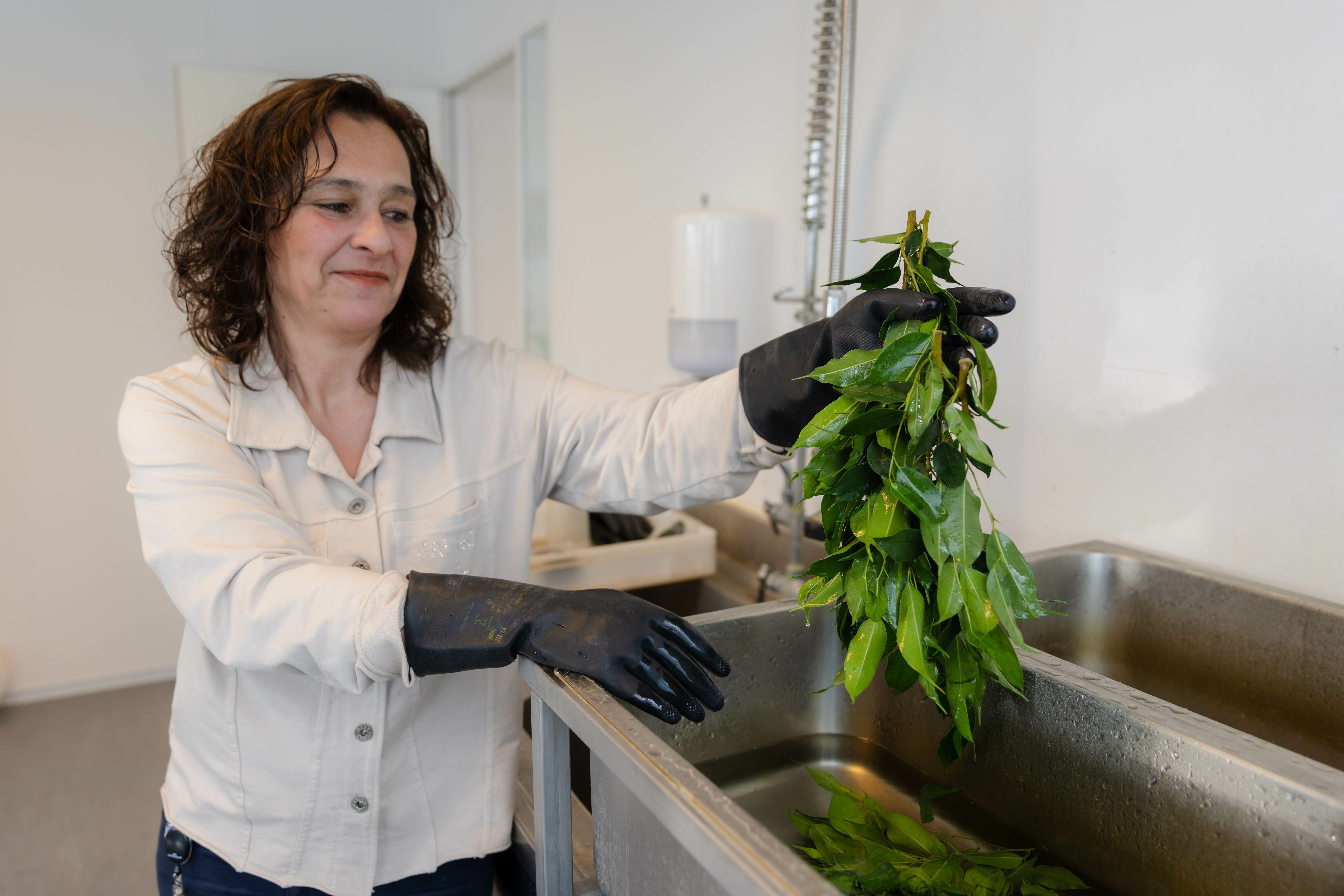 Catherina en Onne kunnen enthousiast vertellen over hun werk en wat zij daarin tegenkomen. Een belangrijk onderdeel is het determineren op basis van spoelmonsters. De monsters die de onderzoekers in Berkel en Rodenrijs in witte emmers krijgen aangeleverd bestaan uit een aantal vers geknipte takken uit het gewas van de betreffende teler. Eerst wordt het plantmateriaal in gelijke groottes geknipt, daarna spoelen ze dit een tijd met heet water om de tripsen, roofmijten en andere diertjes te doden en los te maken van het plantmateriaal. Daarna kunnen zij door herhaaldelijk te zeven de tripsen en roofmijten isoleren en onderzoeken onder de microscoop.