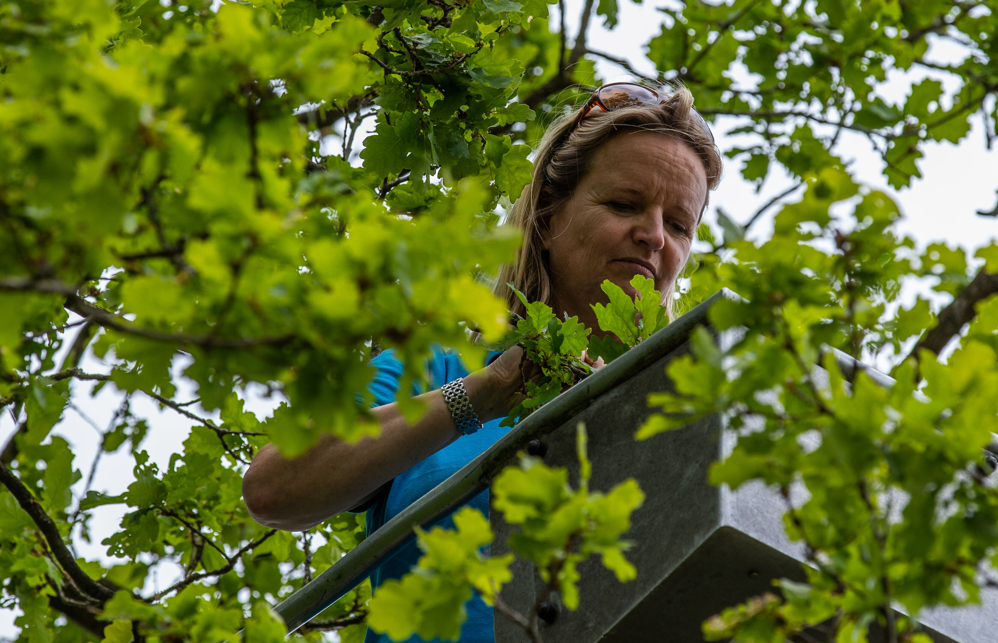 Specialist Rianne Lek controleert in de eikenboom of de Chrysopa terug te vinden is na uitzetting met de drone.
