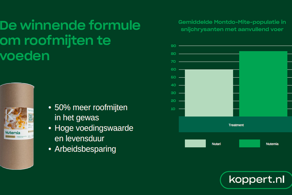 Koppert heeft een nieuw bijvoerproduct voor roofmijten op de markt gebracht waardoor de natuurlijke vijanden nog harder aan de slag gaan om schadelijke plagen bij uiteenlopende gewassen te bestrijden. Nutemia, een nieuwe mix die rijk is aan voedingsstoffen, vormt een aanvulling op het menu van diverse roofmijten en zorgt voor een populatiegroei van tot wel 50%.