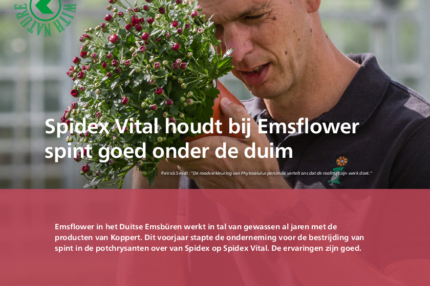 Emsflower in het Duitse Emsbüren werkt in tal van gewassen al jaren met de producten van Koppert. In het voorjaar van 2021 stapte de onderneming voor de bestrijding van spint in de potchrysanten over van Spidex op Spidex Vital. De ervaringen zijn goed.