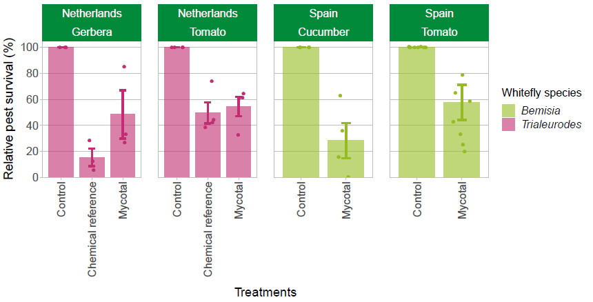 In het verleden zijn er meerdere proeven uitgevoerd om Mycotal te registreren voor de bestrijding van witte vlieg, met zeer goede resultaten. Hieronder staan enkele voorbeelden van de effectieve bestrijding van witte vlieg met dit product, waarbij de overlevingskans van enkele van de belangrijkste soorten zoals Bemisia tabaci en Trialeurodes vaporariorum wordt verminderd. De co-adjuvant Addit kan helpen om de sporen van Mycotal op de bladeren te verspreiden voor een nog effectievere toepassing.