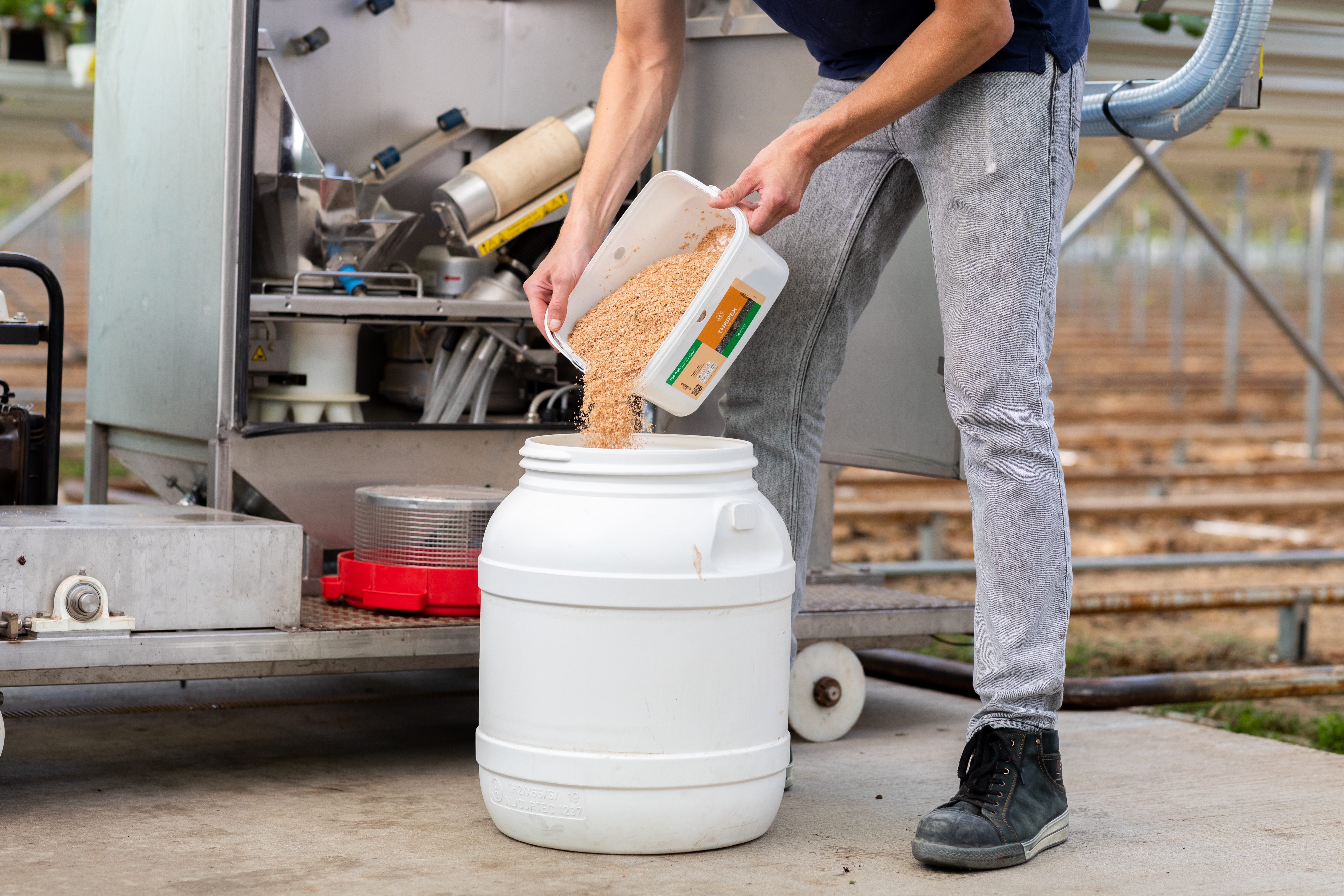 Die verblazer is er inmiddels. Hij heet Natutec Drive en hij is al in gebruik in de teelt van aardbei. Het is een constructie met daarin een elektromotor, in het hart een voorraadtrommel, daaronder een gepatenteerde distributiekast, en ten slotte acht distributieslangen. Via een monitor in de cabine kan de teler hem besturen. De trommel draait rond, dit zorgt voor een constant uniforme verdeling van bestrijders en dragermateriaal.