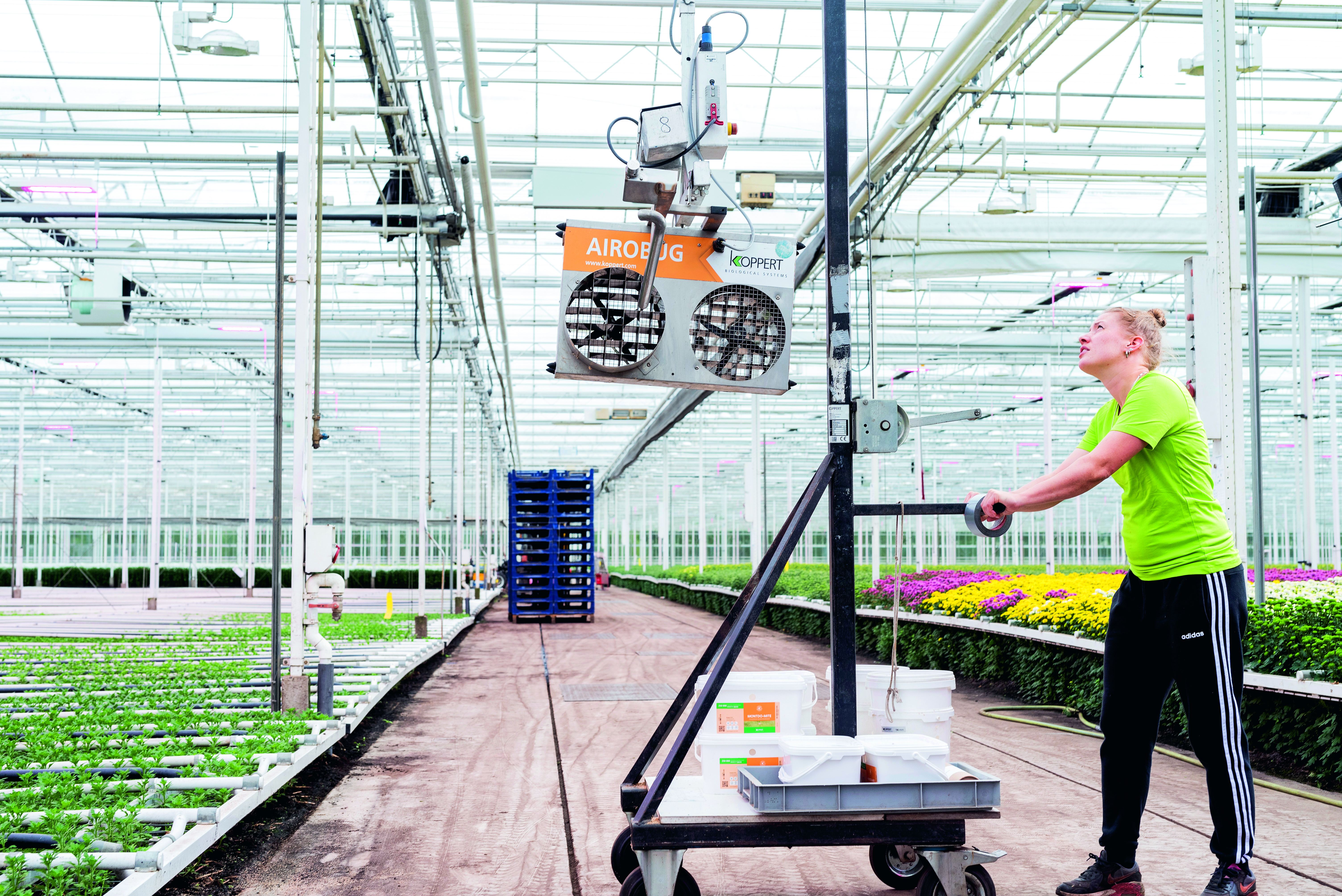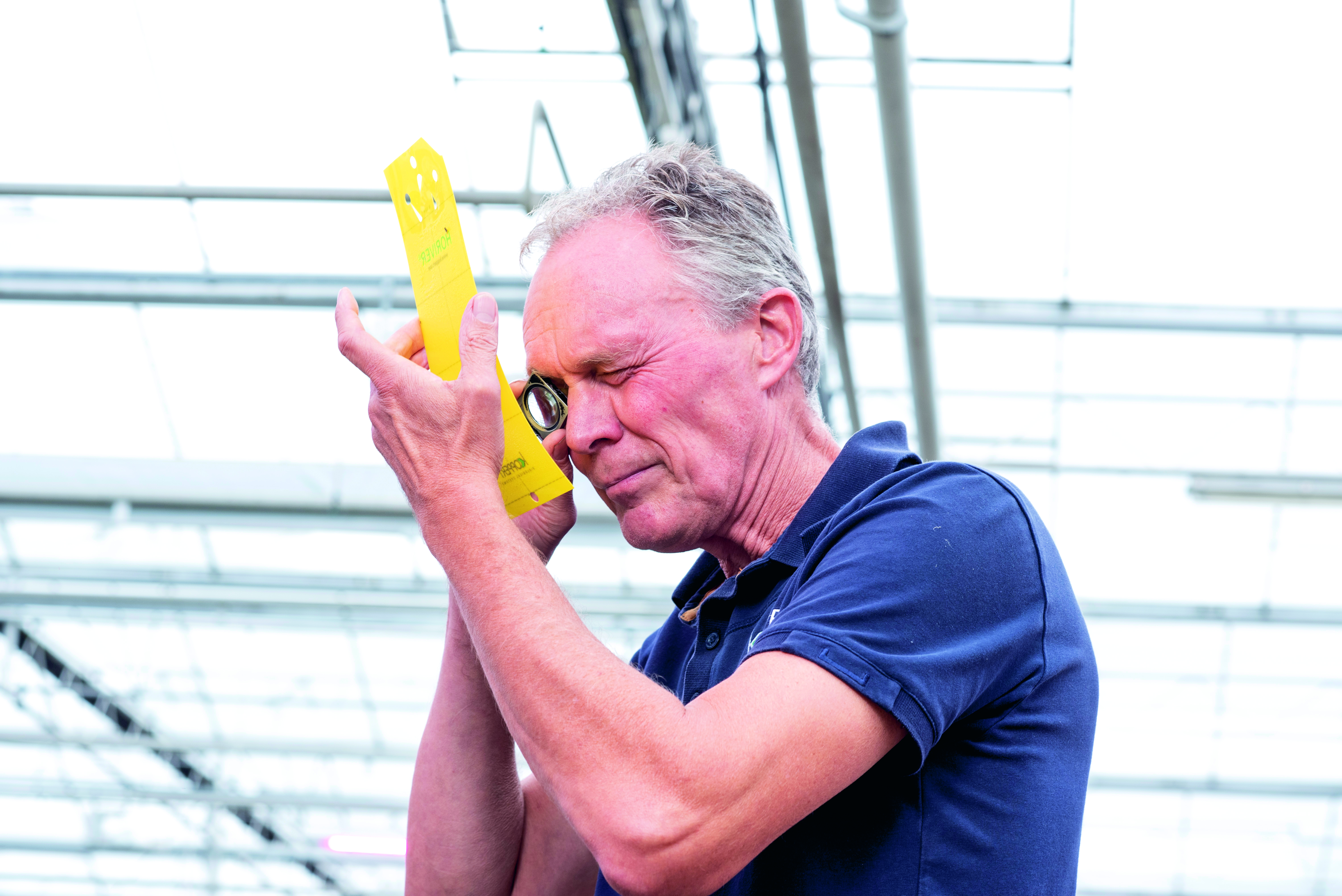 Eén van de bedrijven waar deze winterstrategie met succes werd toegepast is Harry Wubben Flowers, gespecialiseerd in de teelt van Santini’s. Van deze kleinbloemige chrysanten worden op het bedrijf in Nootdorp, met 6 hectare glas, jaarlijks 30 miljoen stelen geproduceerd. Het assortiment omvat tien verschillende cultivars met een teeltcyclus oplopend tot tien weken. “Als het gewas vijf weken oud is, nemen we elke week spoelmonsters om te monitoren hoeveel roofmijten er aanwezig zijn”, vertelt bedrijfsleider Nico van Geest. “Daarnaast is goed scouten ontzettend belangrijk. Hoe eerder je een aantasting waarneemt, hoe beter je deze kan aanpakken.” Lilianne Bok, scout bij Harry Wubben Flowers, maakt dan ook elke week haar fietsronde over het gewas. “De oppervlakte is zo groot dat je niet vanaf het betonpad kan zien wat er achter in de kas gebeurt. Daarnaast ben ik de hele dag attent op eventuele aantastingen. Samen met collega’s proberen we zo veel mogelijk waakzaam te zijn.” En zo kan met succes biologie ingezet worden. Op het bedrijf werden deze winter wekelijks twee keer 2.000 voermijten per vierkante meter verblazen. Het resultaat: er waren 40 procent meer roofmijten aanwezig in het gewas, waardoor de tripstelling in januari flink naar beneden ging.