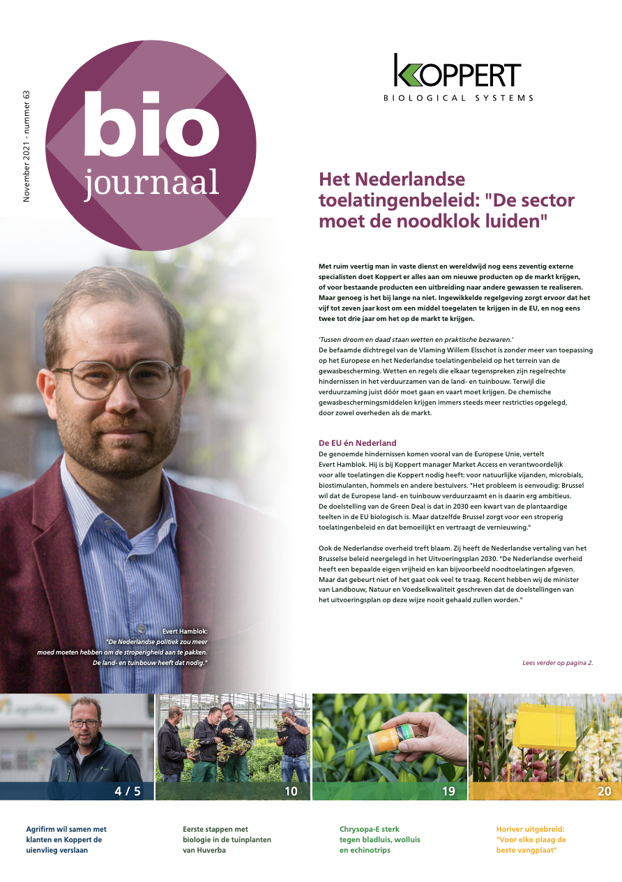 Nieuwe editie Biojournaal online beschikbaar,De nieuwste versie van ons gedrukte Biojournaal ligt sinds deze week bij onze relaties op de deurmat. Wilt u Biojournaal online bekijken? Download de nieuwe editie via de button hieronder. Ontvangt u het Biojournaal niet, maar wilt u dat wel ontvangen? Stuur dan een email met uw complete adresgegevens naar communicatie@koppert.nl. ,