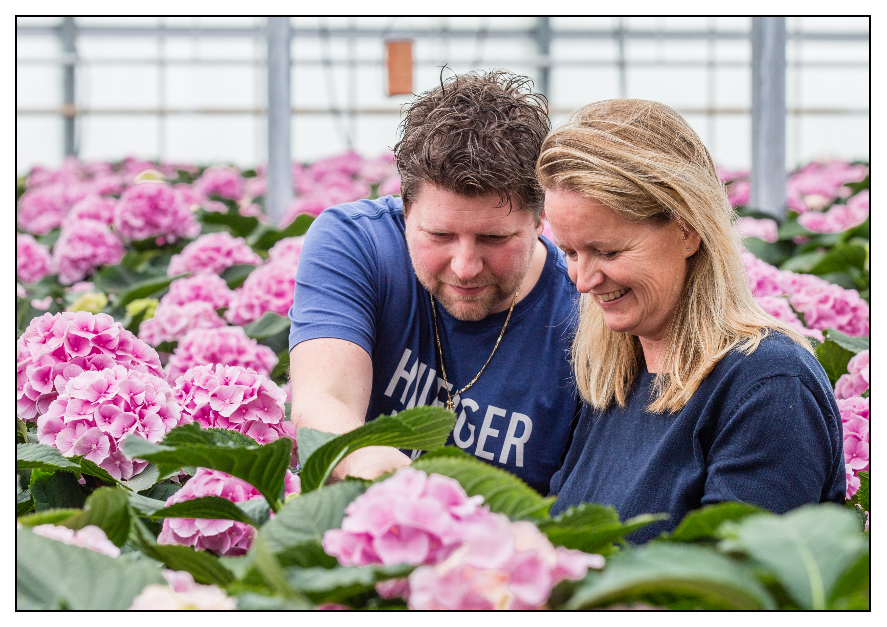 Frans en Rianne Lek in de snijhortensia’s. Het pilot project van Koppert levert aansprekende resultaten op.