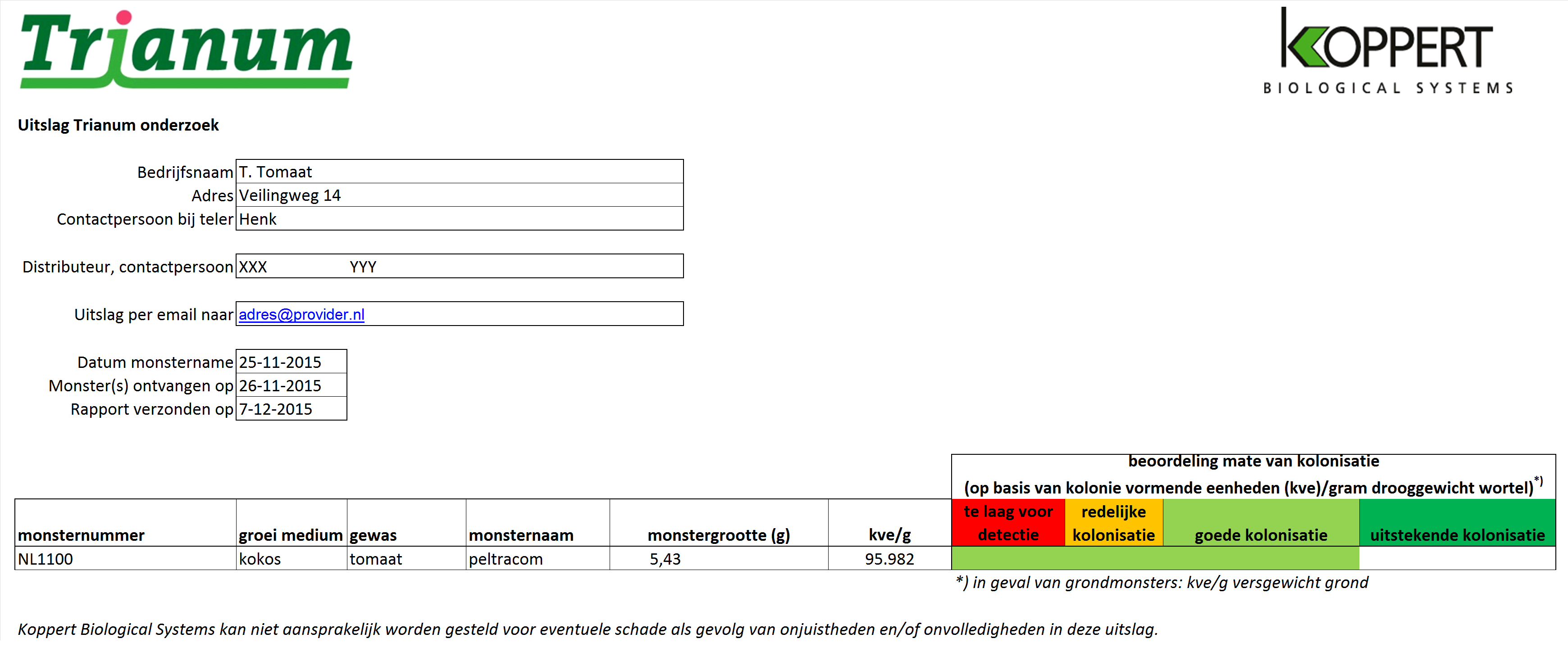 Koppert presenteert de resultaten van het onderzoek in een uitslagformulier. Dit formulier is onlangs gemoderniseerd en zal vanaf eind augustus worden gebruikt. De afbeelding toont een voorbeeld van het nieuwe formulier.