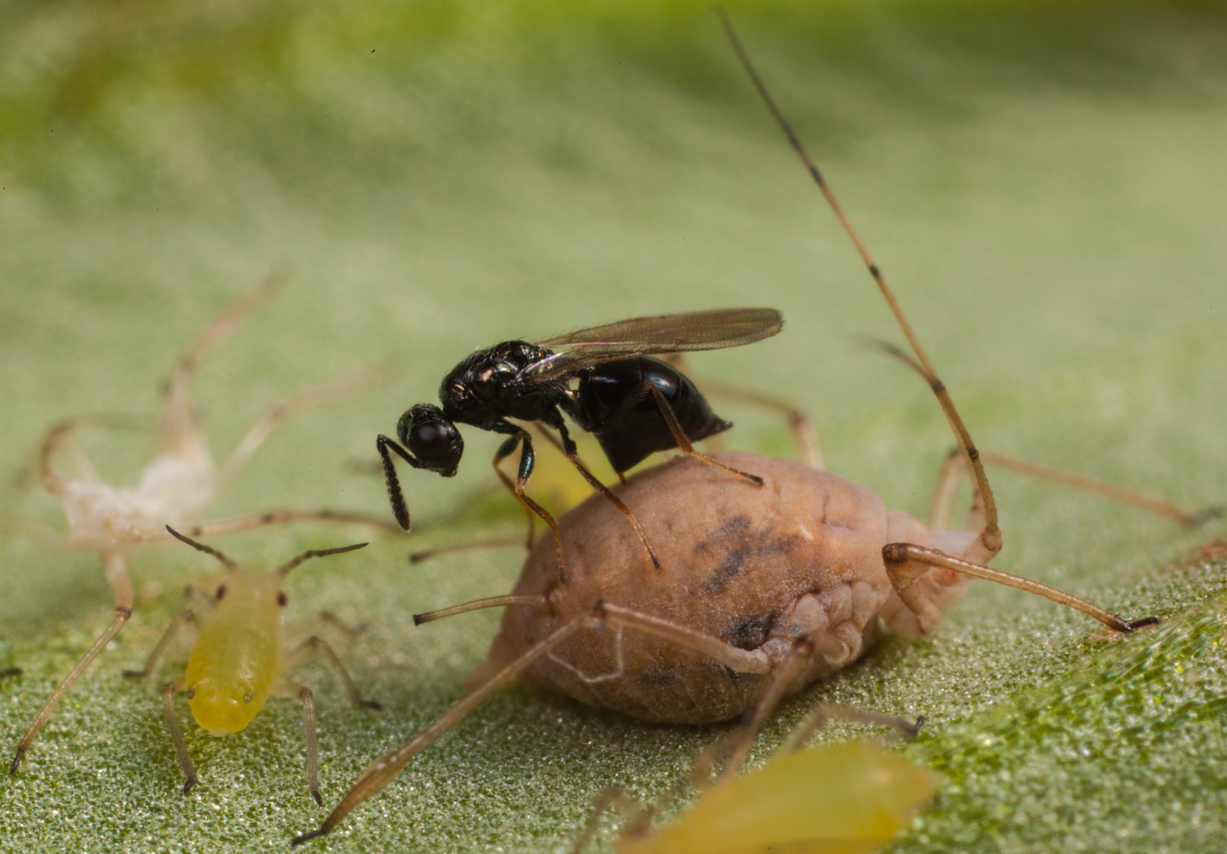 Dendrocerus aphidum en Asaphes vulgaris zijn de twee schadelijkste hyperparasieten. Zij kunnen de populatie-opbouw van sluipwespen die bladluis bestrijden ernstig verstoren. Dat kan de biologische gewasbescherming in gevaar brengen (foto: Nina Fatouros, www.bugsinthepicture.com).
