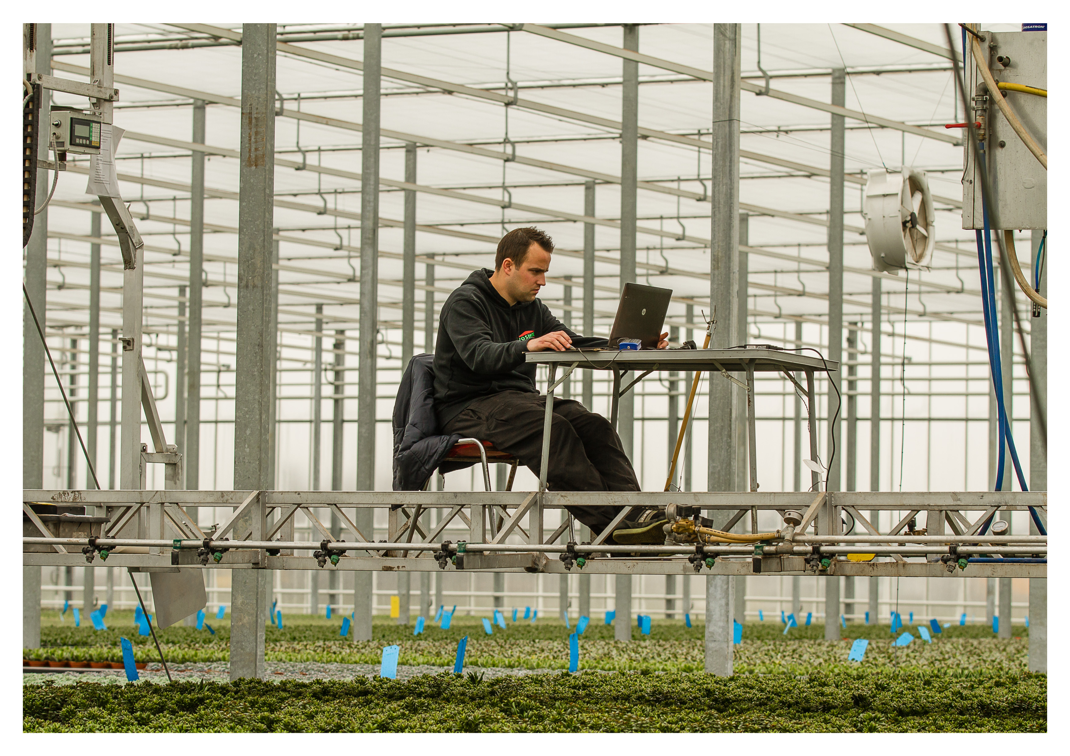 Met gebruik van een teeltkar die boven de gewassen hangt, houdt OVATA de vinger aan de pols van groei en kwaliteit. Op de foto teeltspecialist Jan van Egmond.