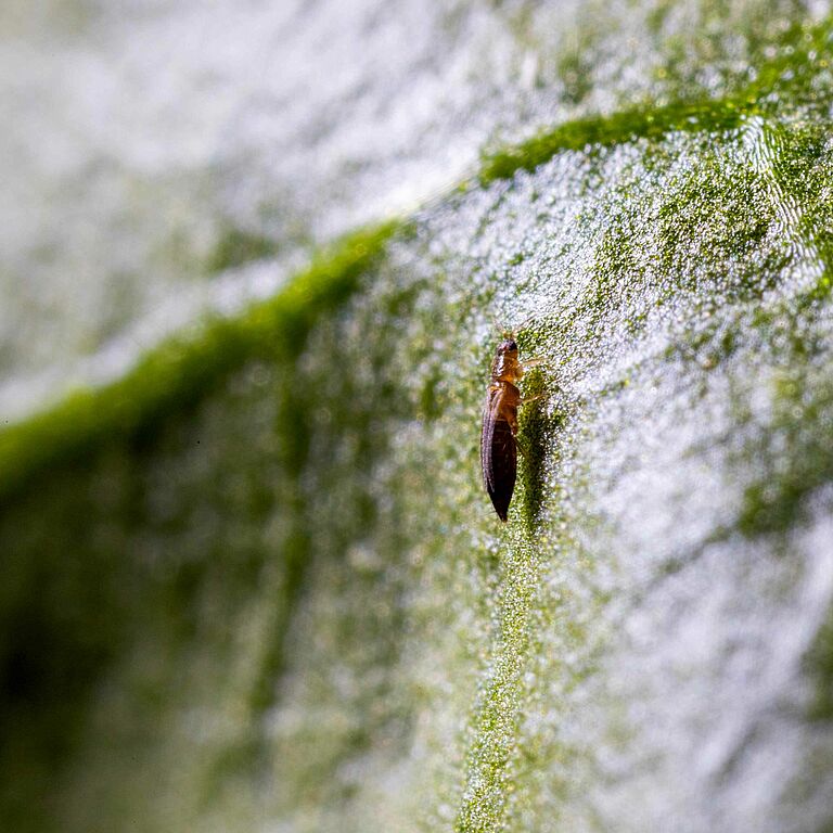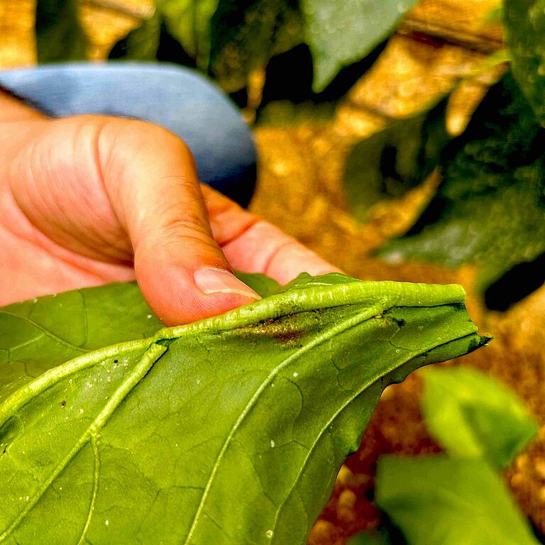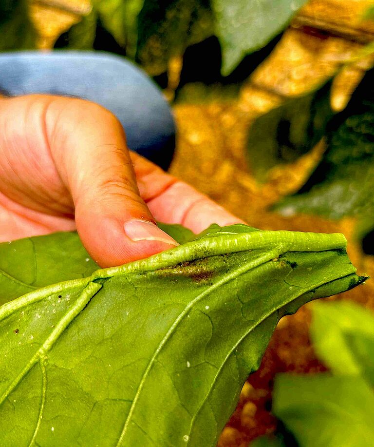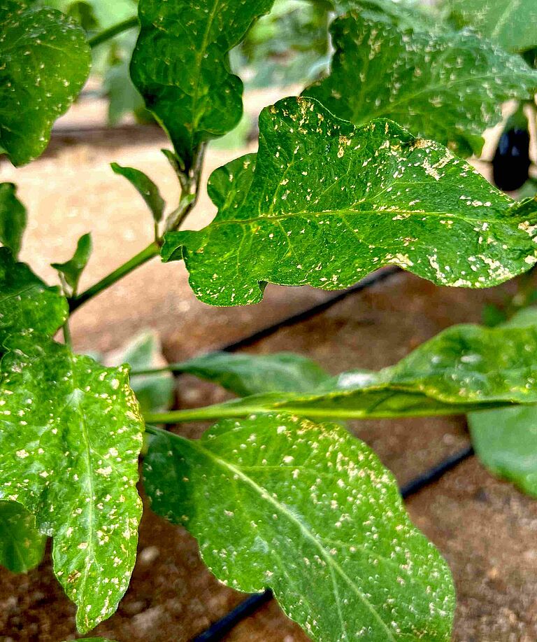 Een van de eerste tekenen van een Thrips parvispinus plaag is de misvorming van jonge scheuten en bladeren. Als deze tripsen zich voeden met plantenweefsel, injecteren ze gifstoffen die ervoor zorgen dat de bladeren verdraaien, omkrullen en vervormd raken. Deze schade kan de groei en algehele gezondheid van de plant ernstig beïnvloeden, waardoor de plant minder efficiënt kan fotosynthetiseren en zich minder goed kan ontwikkelen.