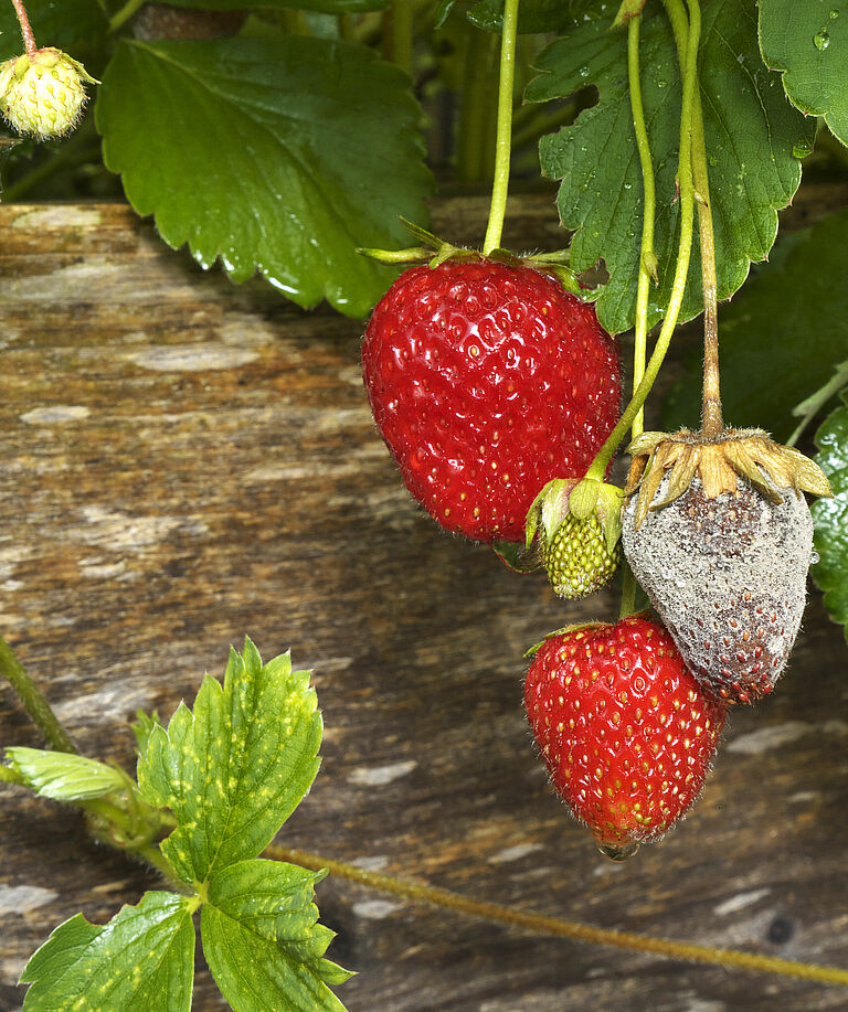Bij groente en aardbei tast grauwe schimmel (Botryotinia fuckeliana/Botrytis cinerea) vruchten aan. Potplantstekken sterven af door een infectie die is overgedragen vanaf een besmette moerplant.