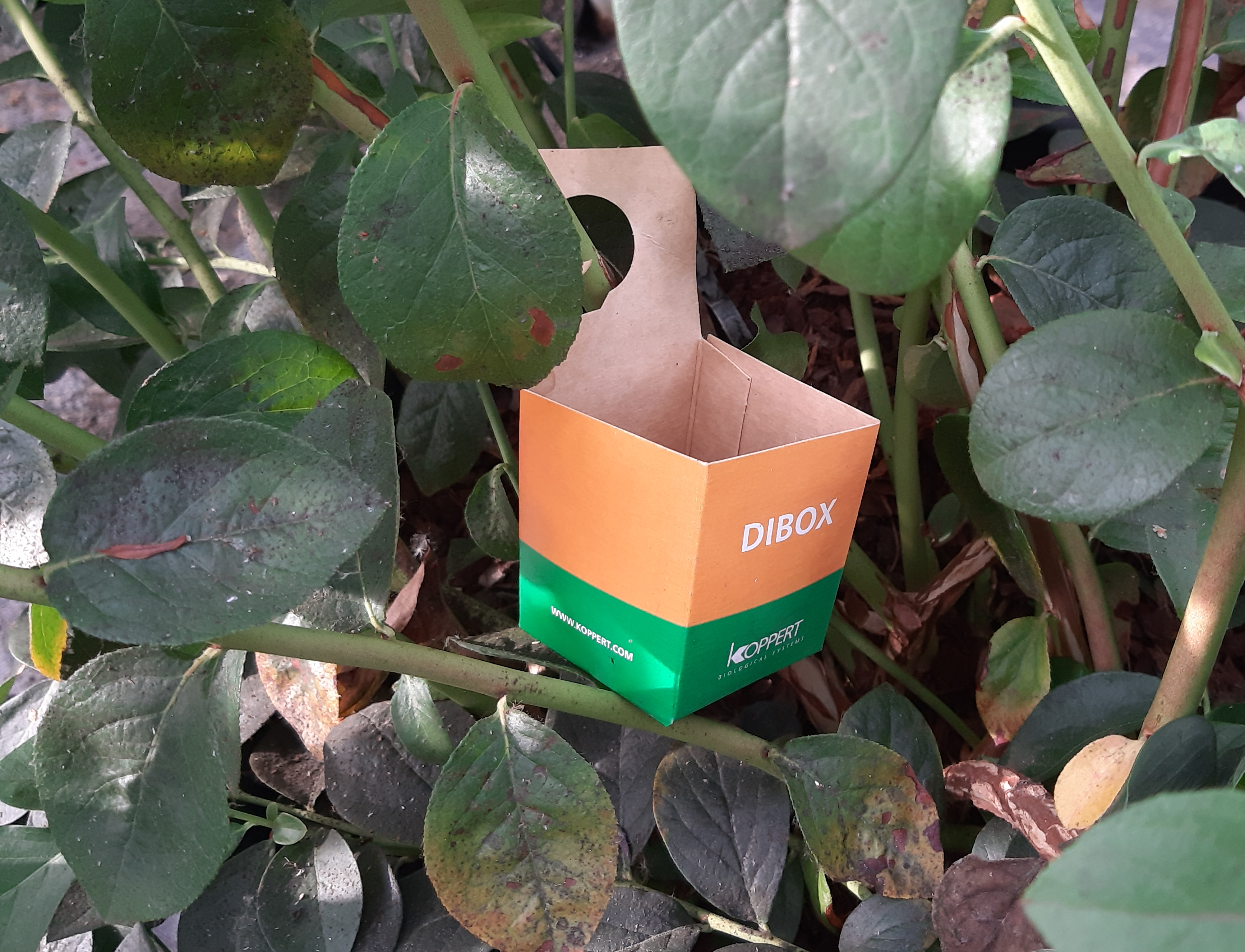 Ook tegen andere plagen, zoals bladluizen, zijn er veel kansen voor biologische gewasbescherming. In het voorjaar bevat het gewas nog weinig scheuten en is daarom het advies om sluipwespen in Diboxen uit te zetten, zoals op de afbeelding hiernaast.