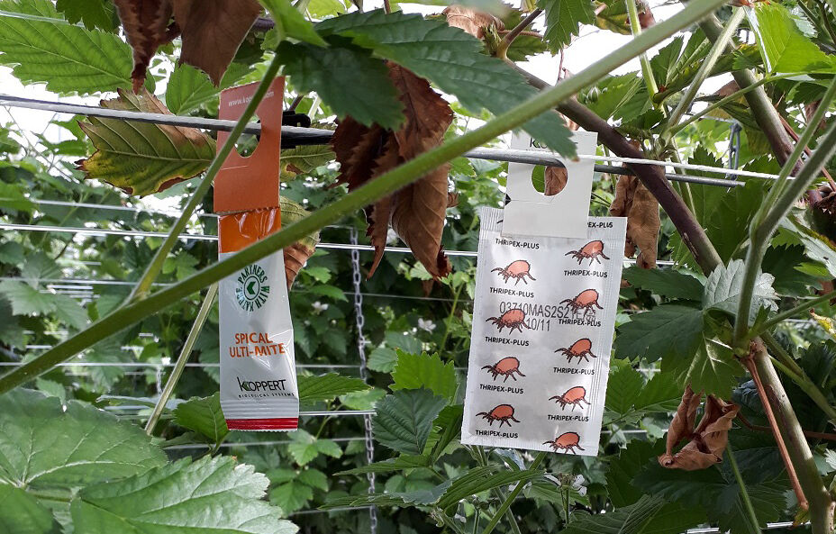 Half januari is de voorjaarsteelt van bramen onder glas gestart bij Van de Bosch in Berkel en Rodenrijs. Eind februari is begonnen met het uitzetten van verschillende soorten biologie zoals Thripex-Plus zakjes (N. cucumeris) tegen de trips en onze nieuwe Spical Ulti-Mite zakjes (N. californicus) tegen de spint. De voordelen van het nieuwe Spical Ulti-Mite zakje komen goed tot zijn recht doordat het zakje goed kan gedijen tegen extreme luchtvochtigheid en temperaturen. Verder wordt er nog Aphidend (A. aphidimyza) ingezet tegen de luis. Ook vliegen de hommels weer volop rond om de bloesems van een goede bestuiving te voorzien.