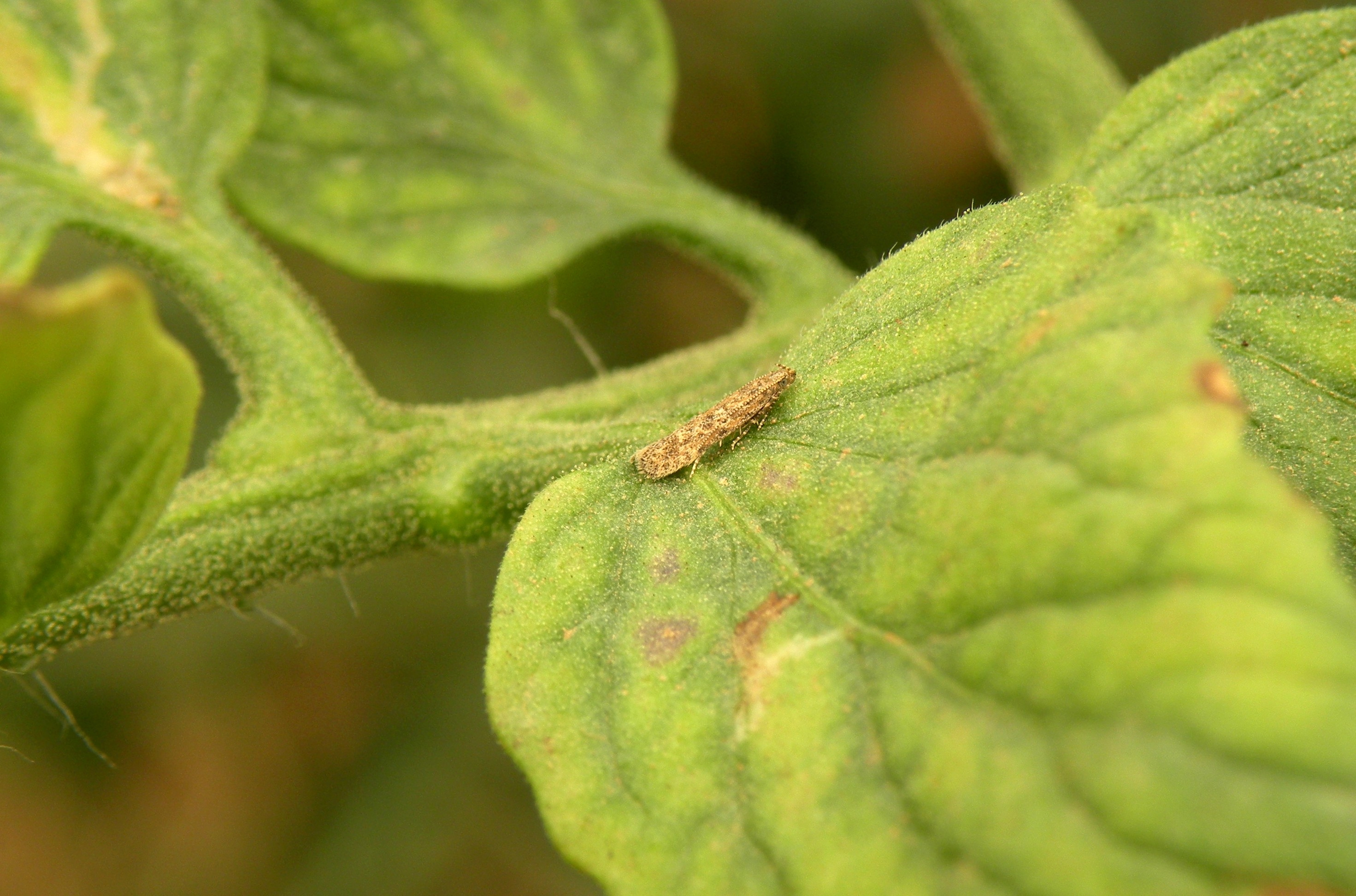 In tomaat kunnen telers last hebben van Tuta absoluta. De bekendste symptomen zijn de vlekvormige mijnen in de bladeren. Binnenin deze mijnen zijn zowel de rupsen als hun donkere uitwerpselen goed zichtbaar.