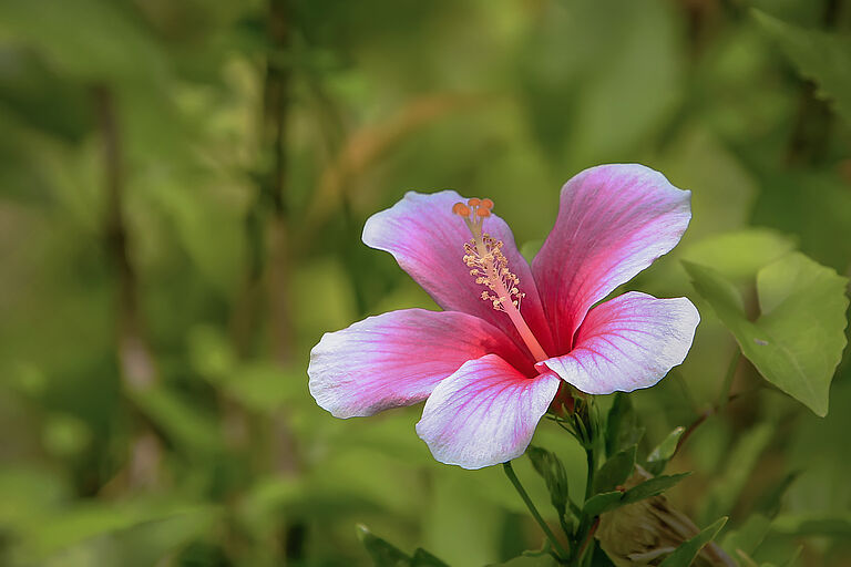- Hibiscus staat bekend om zijn grote, sierlijke, trompetvormige bloemen. Deze bloemen hebben vijf of meer bloembladen en hun kleur varieert van wit tot roze, rood, oranje, perzik, geel en paars.